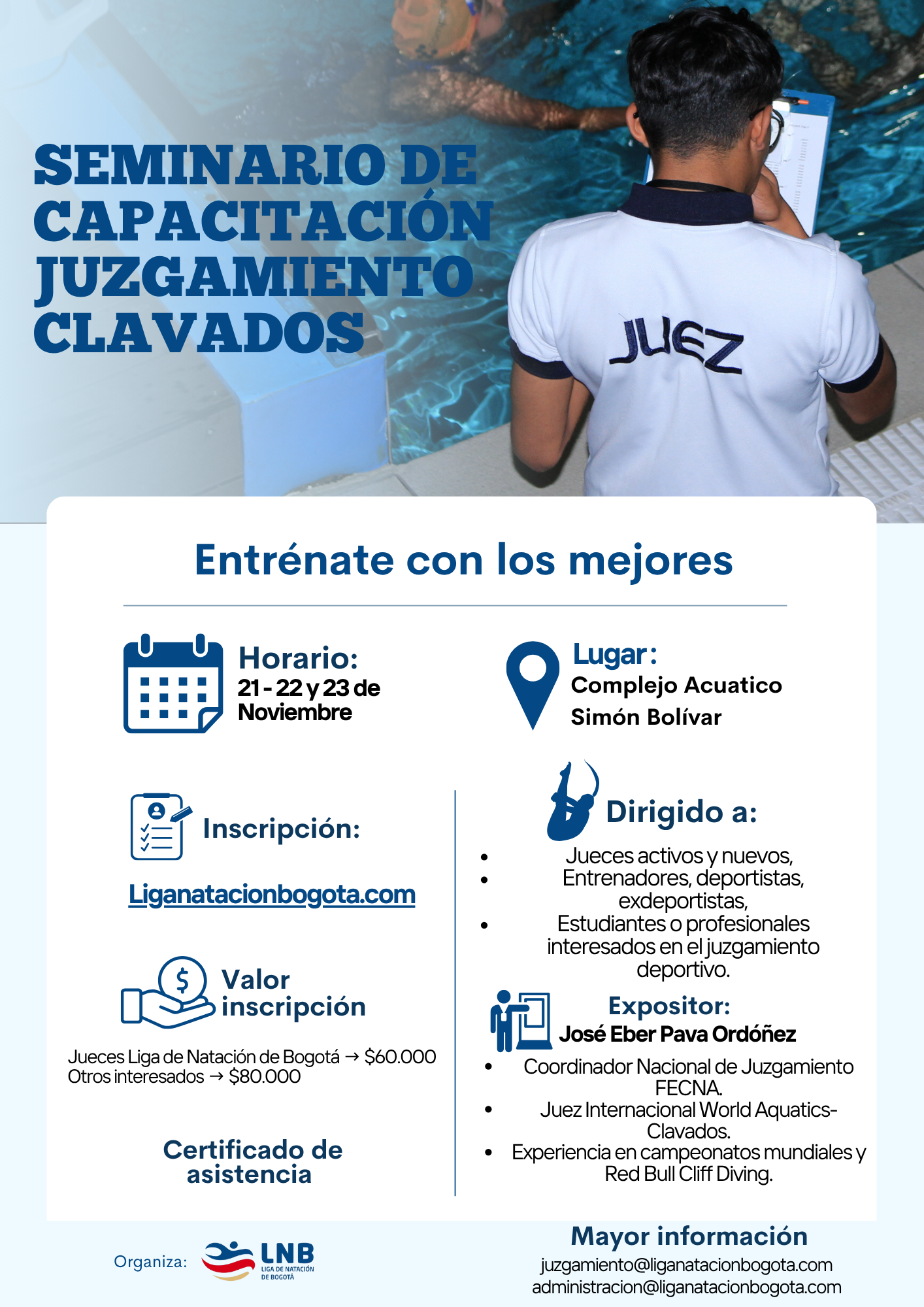 Las inscripciones estarán abiertas hasta el 14 de noviembre de 2025 y tienen un costo de $60.000 para jueces activos de la Liga y $80.000 para nuevos participantes o entrenadores. Quienes completen la totalidad del curso recibirán un certificado de asistencia otorgado por la Liga de Natación de Bogotá, reafirmando su compromiso con la formación y el fortalecimiento del juzgamiento en la disciplina de los clavados.